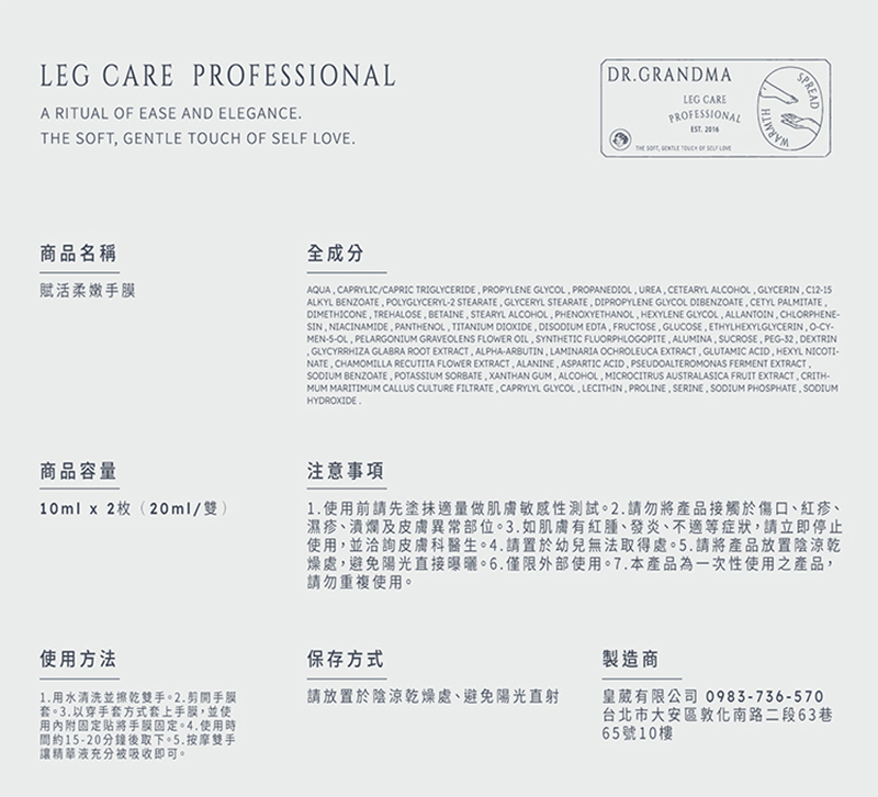 A:手膜幫助緩解每日曝曬在紫外線、酒精消毒而手變得粗糙的情況;腿膜則是可以緩解每日走路摩擦、或穿靴子高跟鞋帶來的粗糙情況。